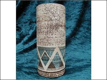 Description: Height: 5.25 inches Width: 2.25 inches Light brown base with a geometric design in blue and dark brown, the interior is finished in a white tin glaze. |