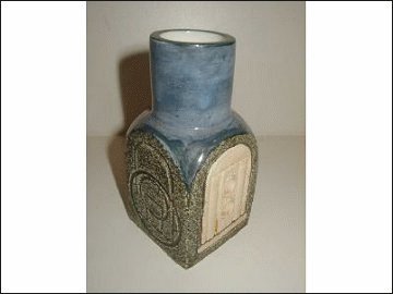 Description: Height: 6 inches Blue and cream textured surfaces with geometric incised shapes including one that appears to be a window. Sold on eBay for £59 Jan 2003 |